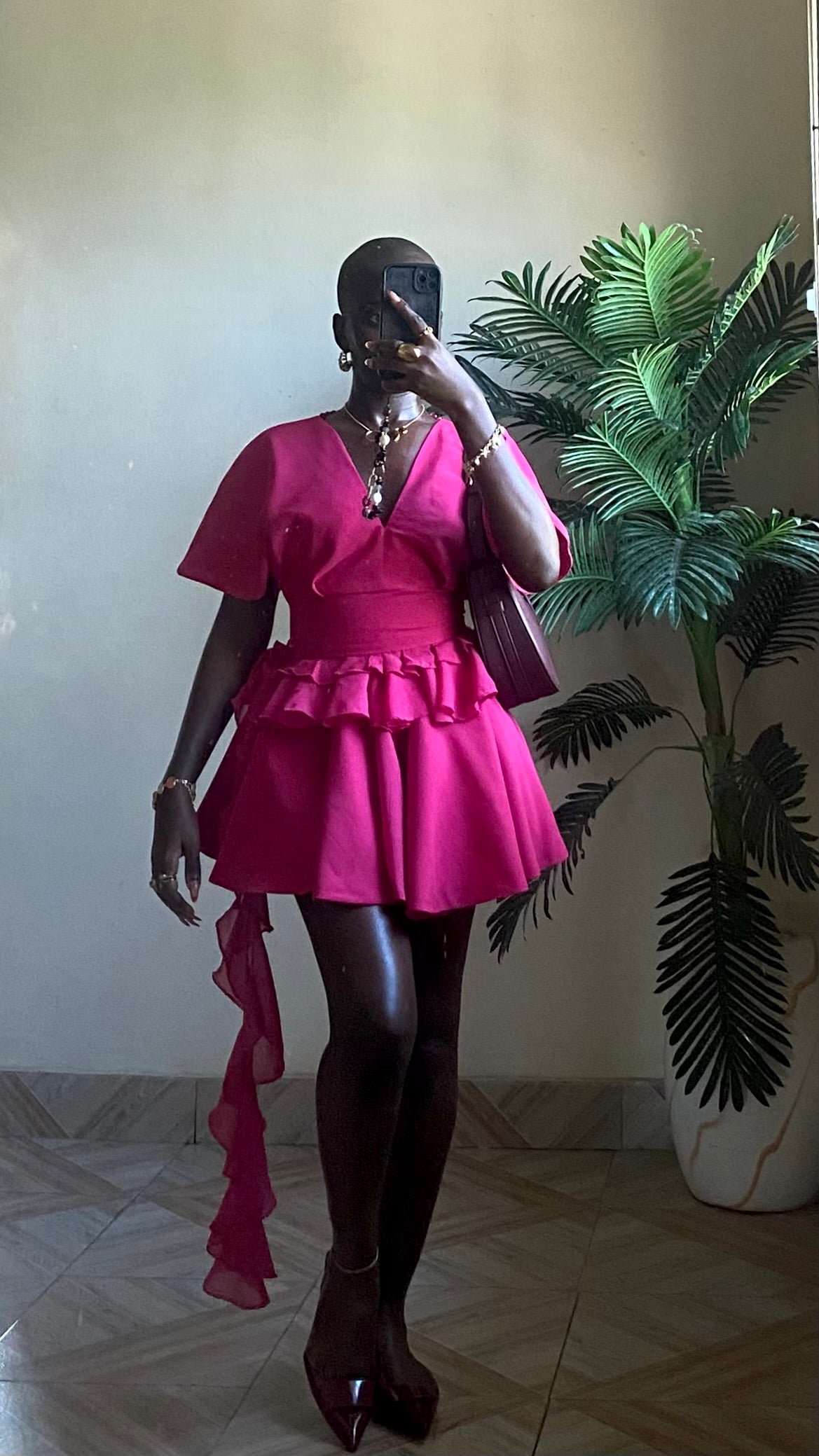 DEDE delicately balances structure with subtle sultriness, a v neck front and back blouse with ruffled cinched waist, and a structured flare skirt. The DEDE skirt is available in micro-mini, and mini.